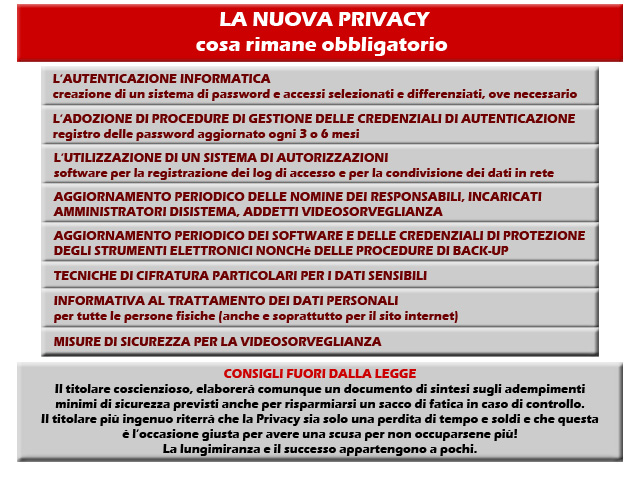 Adempimenti che rimangono in vigore, ma non dovranno più essere riportati nel D.P.S. per cui, rispetto a quando i processi di semplificazione riguardavano solo le imprese (che trattano dati per finalità amministrativo-contabili), stavolta, la sua eliminazione riguarderà tutti i titolari, pubblici e privati.
